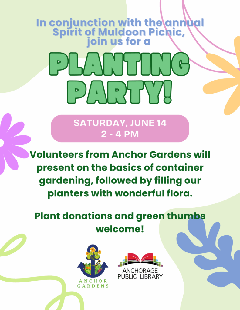 Join us at the Muldoon Library (1251 Muldoon Rd) for a FREE Container Gardening Workshop at the Muldoon Library! Help us beautify the parking lot at our beloved local library with various shrubs and flowers in the large cement parking lot planters.